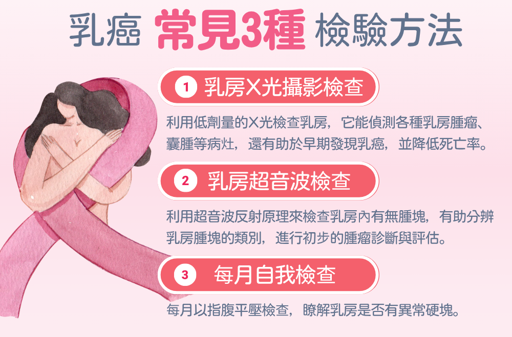 乳癌的篩檢工具有以下幾種,根據年齡與個人狀況會有所不同: