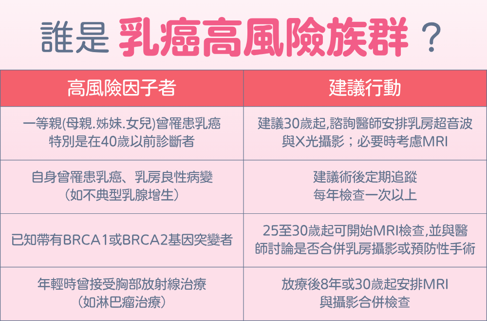 根據國民健康署與國際癌症篩檢指引,以下族群屬於乳癌高風險對象,建議由專業醫師評估是否需提前開始篩檢,或增加篩檢頻率與使用進階影像工具: